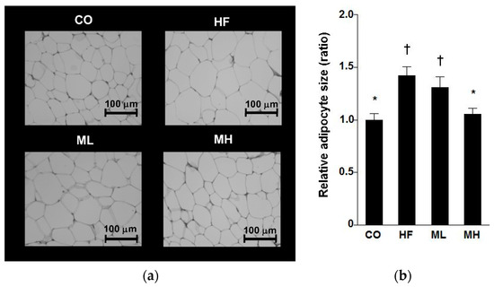 Effect of mushroom intake on white adipose tissue in mice. (a) Perinephric adipose tissue sections from mice of each group (hematoxylin and eosin, scale bar = 100 µm); (b) Average size of adipocytes in perinephric adipose tissue. Values are mean ± standard error, n = 8. CO: control diet, HF: high fat diet, ML: mushroom low (0.5%) diet, MH: mushroom high (3%) diet. †: p < 0.05 (vs. CO group), *: p < 0.05 (vs. HF group).