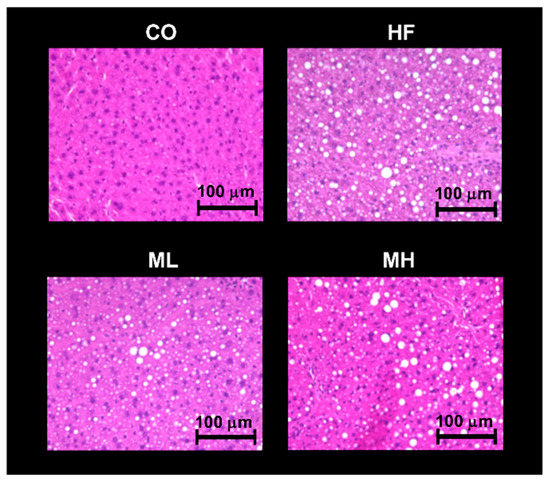 Effect of mushroom intake on liver histology in mice. Liver sections from mice of each group (hematoxylin and eosin, scale bar = 100 µm). CO: control diet, HF: high fat diet, ML: mushroom low (0.5%) diet, MH: mushroom high (3%) diet.