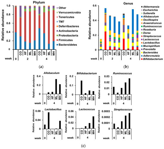 Modulation of gut microbiota by mushroom intake. Fecal microbiota composition of mice after 0 weeks, 2 weeks and 4 weeks on a control diet (CO), high fat diet (HF), mushroom low (0.5%) diet (ML), or mushroom high (3%) diet (MH). (a) Phylum level and (b) genus level taxonomic distributions of fecal microbial communities determined by next generation sequencing. (c) Relative abundance of short chain fatty acid-producing bacteria (Allobaculum, Bifidobacterium and Ruminococcus) and lactic acid-producing bacteria (Lactobacillus, Lactococcus and Streptococcus).