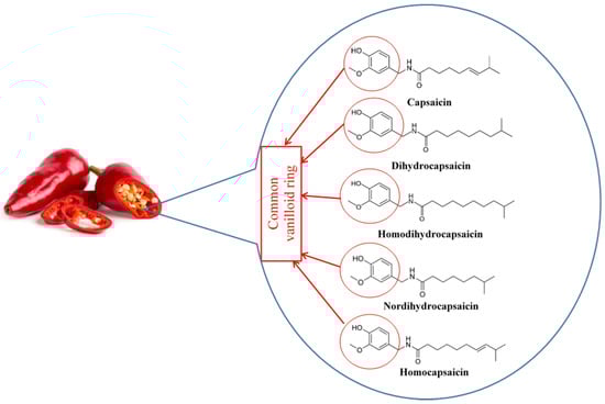 Capsaicin was first isolated in 1876 [1], its structure was determined in 1919 [2], and it was chemically synthesized in 1930 [3]. Capsaicin, dihydrocapsaicin, nordihydrocapsaicin, homocapsaicin, and homodihydrocapsaicin constitute the capsaicinoids [4] (Figure 1). Capsaicin and dihydrocapsaicin constitute approximately 90% of the capsaicinoids found in any fruit belonging to the Capsicum genus, with capsaicin constituting 70–80% [5,6]. Capsaicin is a pungent molecule that can affect thermoregulation, trigger autonomic reflexes, and is highly absorbed [4,7]. Capsaicin is commercially available as creams and patches for treatment of pain in neuralgias and neuropathies [8,9]. It is in the pipeline for phase III clinical trials as a treatment option for rheumatoid arthritis, postoperative pain, and chronic neuropathic and musculoskeletal pain [7]. Here, we will review the pharmacological potential of capsaicin to reduce metabolic syndrome.