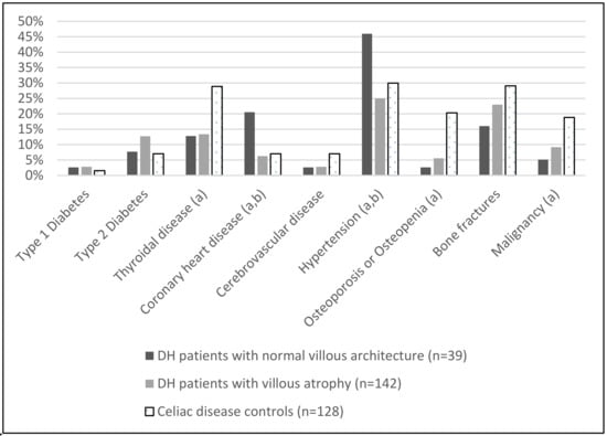 Percentages of dermatitis herpetiformis (DH) patients with normal small bowel mucosal villous architecture and with villous atrophy at diagnosis, and coeliac disease control patients with long-term illnesses or complications at the time of the follow-up study. (a) Statistically significant difference (p < 0.05) between the three study groups; (b) statistically significant difference (p < 0.05) between DH patients with normal villous architecture and DH patients with villous atrophy at diagnosis.
