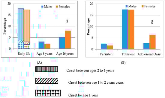 Prevalences of milk- related symptoms by gender in early life (to age 4 years) and at ages 8 and 16 years, including timing of onset (persistent *, transient † and adolescent-onset ‡) of milk- related symptoms (N = 2819). (A) Early life and ages 8 and 16 years; (B) Timing of onset. * Milk-related symptoms in early life and/or at age 8 years and at age 16 years; † Milk-related symptoms in early life or at 8 years, but not at age 16 years; ‡ Milk-related symptoms at 16 years, but not in early life or at 8 years; § p < 0.002 vs. the opposite sex at the corresponding time point.