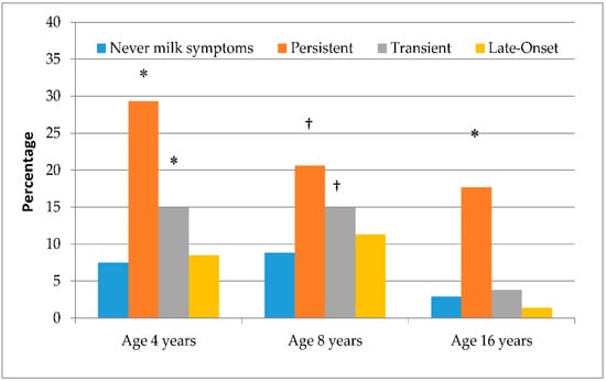 Prevalence of milk IgE reactivity (≥0.35 kUA/L) at ages 4, 8, and 16 years in relation to phenotype of milk-related symptoms (N = 1543). * p < 0.001 vs. never milk-related symptoms to the corresponding age; † p < 0.05 vs. never milk-related symptoms up to the corresponding age.
