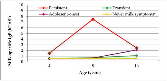 Median milk IgE levels amongst those with milk IgE reactivity (≥0.35 kUA/L) at ages 4, 8, and 16 years in relation to phenotype of milk-related symptoms (N = 1543). * Never milk symptoms to the corresponding age. Compared to mean milk IgE levels at each amongst those with persistent symptoms, all levels are significantly lower (p < 0.05) for those with the other phenotypes.