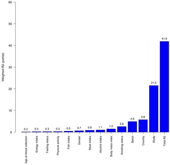 The Principal Component Partial R-square (PC-PR2) method [28] was applied to estimate the contribution to total variability in metabolite concentrations attributed to self-reported alcohol intake (natural logarithm of continuous alcohol intake + 1) and other factors, including sub-study (categorical), batch (categorical), sex (categorical), age at blood collection (continuous), country (categorical), fasting status at blood collection (categorical: <3 h/3–6 h/>6 h/unknown), smoking status at recruitment (categorical: current/former/never/unknown), BMI (continuous), Cambridge physical activity index (categorical: inactive/moderately inactive/moderately active/active/unknown), and daily intake of energy, meat and meat products, fish and shellfish (all continuous). Firstly, principal component analysis was conducted on metabolite concentrations, and the components explaining > 80% of the total variability were retained (c = 18). Then, in multiple linear models the component scores were, in turn, regressed on the list of aforementioned independent variables, and Rpartial2 for each covariate was estimated separately for each component. Lastly, an overall Rpartial2 for each covariate was calculated as a weighted average, using the eigenvalues of each principal component c as weights. As a result, the Rpartial2 provides a measure of the variability in the ensemble of metabolite concentrations that each covariate contributes to explain [28].