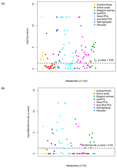 - Floegel, A.; Drogan, D.; Wang-Sattler, R.; Prehn, C.; Illig, T.; Adamski, J.; Joost, H.G.; Boeing, H.; Pischon, T. Reliability of serum metabolite concentrations over a 4-month period using a targeted metabolomic approach. PLoS ONE 2011, 6, e21103. [Google Scholar] [CrossRef] [PubMed]