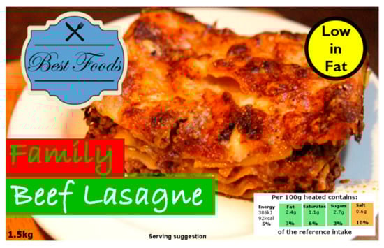 Example of food packaging with claims used in survey. Lasagne photograph from Leon Wilson (https://www.flickr.com/photos/chop/973369384)—CC BY 2.0 (https://creativecommons.org/licenses/by/2.0/). Modified to include labels and text.