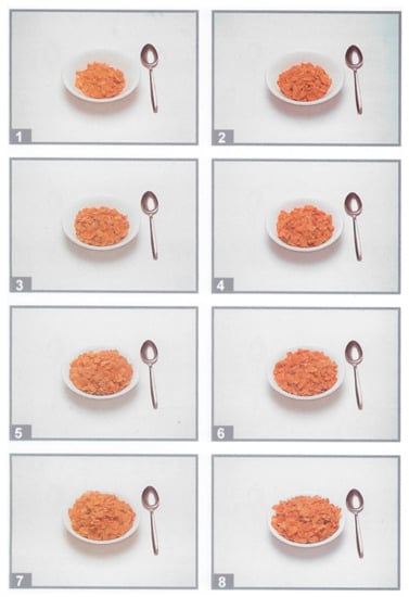 For portion size selection, participants were asked “Imagine you are only having this specific product for breakfast/lunch/dinner/a snack. How much would you eat?” For each product, participants selected a portion from a show card which contained a series of eight portion size photographs (see Figure 2 for an example). Each series of portion size photographs was taken from a validated food atlas [34], with portions increasing in weight from the fifth through to the 95th percentile of portion size from a population diet and nutrition survey [35].