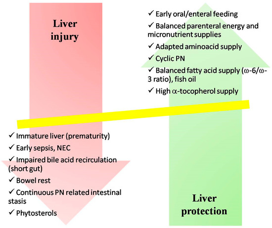 Furthermore, the infantile liver is probably more susceptible to damage from lipid peroxidation and sepsis. Among premature babies, those who develop necrotizing enterocolitis (NEC) seem to be more susceptible to developing IFALD because they are exposed to further risk factors including high rate of sepsis, intestinal obstruction, short bowel, and disrupted enterohepatic bile acid circulation, high glucose and lipid intake to meet energy needs, and the requirement of continuous rather than cyclical PN infusion [4].