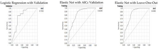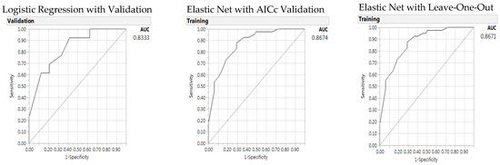 Table 4 presents significant individual parameters for HEI 80 prediction. A baseline LR model with validation was constructed with five significant individual parameters; all five parameters are HEI items: whole fruit (1 cup), milk or soy drink (6 oz), whole grain (1 oz), saturated fat (15 g), and oil nut intakes (1 oz) (all p < 0.05, amount per component representing the medians of this sample), with no significant parameters from other categories of demographic or RDI parameters. The results of baseline LR with validation are shown in the left panel of Table 4. Then, two GR models were developed using Adaptive Elastic Net with AICc validation and LOO cross validation methods to predict the probability of healthy eating with HEI 80 (the middle and right panels of Table 4). In both GR validation models, oil and nut intake did not present statistical significance. The GR AICc validation model presented as the best model with lowest misclassification rate and highest AUC, but higher AICc than the baseline LR model. The AUC as shown in Figure 1 with the baseline LR model presented 0.8333 and the GR Elastic Net AICc model and LOO model with AUC of 0.8674 and 0.8671, respectively.