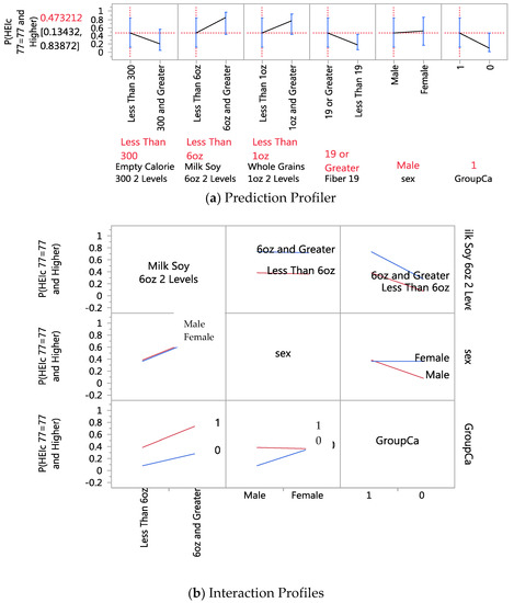 Using SAS JMP programming (SAS Institute, Cary, NC, USA), we identified significant parameters of healthy eating in the diverse groups of families of CRC patients with their family members. As dietary habits can be modified, specific domain parameters for healthy eating can be helpful for these families to focus on key food items, with specific amounts for minimum intake levels or restricted intake levels. For a demonstration study of future dietary interventions, we used machine learning-based analytics, including ensemble methods and GR AICc and LOO validation models, for small-sample studies to validate the analyses by the random subsets of samples [75]. We further presented an interaction profiler including 3-way interactions (interaction profile includes bi-variate interactions in association with the outcome) for the best quality and optimal model.