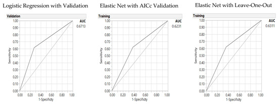 Predictors of the Glycemic Index (53.8): Area under the receiver operating characteristic curve (AUC) for baseline logistic regression (left), Elastic Net with Akaike’s information criteria with correction (AICc) validation (middle) and Leave-One-Out validation models (right).