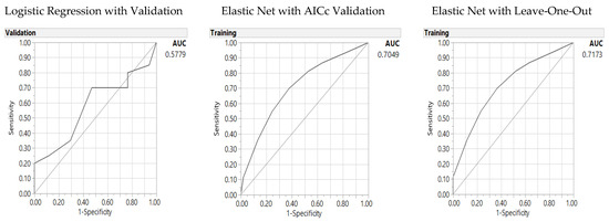Predictors of the Healthy Eating Index (80): Area under the receiver operating characteristic curve (AUC) for logistic regression (left), Elastic Net with Akaike’s information criteria with correction (AICc) validation (middle) and Leave-One-Out validation models (right).