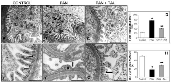 PAS staining did not reveal any damage to glomeruli, and similarly no differences in glomerular area were observed in experimental groups (data not shown). These findings confirmed the hallmark of “minimal change nephrosis” (MCD), i.e., absence of glomerular damage under light microscopy analysis. So, we analyzed the filtration barrier by transmission electron microscopy, the elective method that best defines proteinuria-induced changes in MCD patients []. In control rats, regular podocytes’ foot processes adhered to the basal membrane and well-structured slight diaphragms were visualized (Figure 1A,E). In contrast, in PAN-injected rats, prominent fusion of pedicels and tight junctions between pedicels, together with limited slight diaphragms, were observed (Figure 1B,F). In contrast, after TAU pre-treatment, more regular thin foot processes and recovered filtration slits in the glomerular barrier were evident (Figure 1C,G). Estimation of foot processes width on electron micrographs demonstrated a significant enlargement in PAN-injected rats (750 nm) when compared to the control group (200 nm), but a decreased width in the PAN supplemented with TAU group (Figure 1D). These data indicated that TAU intake partially improved podocytes effacement in the PAN-treated group. Slight diaphragms quantification significantly decreased by 42% in the PAN group (p < 0.05), but increased by 21% in PAN plus TAU supplemented rats (Figure 1H). These values indicated that TAU pre-treatment positively influenced the distribution of glomerular filtration sites.