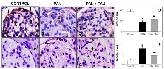 Glomerular cytoskeletal markers. (A–C) Nephrin and (E–G) claudin 1 in PAN nephrotic rats are reversed by TAU taurine pre-treatment. Arrows indicate strong nephrin immunostaining in (A) control, (B) scattered in PAN group, and (C) condensed after TAU supply. Claudin 1 staining was (E) absent in control rats, (F) evident (arrows) in glomeruli and epithelial parietal (Ep) cells in PAN group, and (G) weak in TAU pre-treated rats. Bar represents 20 µm. Quantitative evaluation of (D) nephrin and (H) claudin 1 immunostainings in glomeruli are expressed as arbitrary units. * p < 0.05 statistically significant versus control group; ** p < 0.05 significant versus PAN group.
