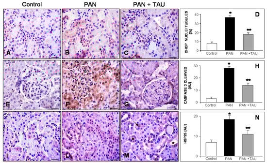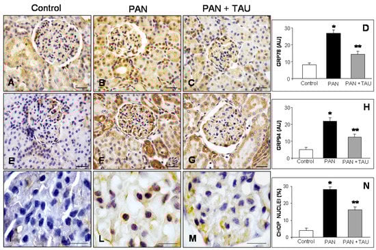 Endoplasmic reticulum stress makers. (A–C) GRP78, (E–G) GRP94, (I–M) C/EBP homologous protein (CHOP) in (A,E,I) control rats, (B,F,L) PAN nephrotic rat model are ameliorated by (C,G,M) TAU pre-treatment. Bar represents 20 µm. Quantitative analysis of immunostaining for (D) GRP78 and (H) GRP94, expressed as arbitrary units, and (N) of nuclear positive percentage of CHOP immunostaining. * p < 0.05 statistically significant versus control group; ** p < 0.05 significant versus PAN group.