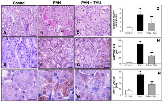 Tubular Inflammation and Mitochondrial Stress. (A–C) PAS histopathology, (E–G) activated caspase 1-p10 and (I–M) mitochondrial chaperone GRP75 stainings in the proximal tubules of (A,E,I) control rats, (B,F,L) PAN nephrotic rats and (C,G,M) PAN rats orally pre-treated with TAU. (A–C) The arrows identify the proteinaceous casts and the asterisks show the tubular dilatation. Bar represents 20 µm. Tubular damage expressed as (D) tubular injury score, (H) quantitative estimation of caspase 1-p10, (N) and GRP75 immunostainings, expressed as arbitrary units. * p < 0.05 statistically significant versus control group; ** p < 0.05 significant versus PAN group.
