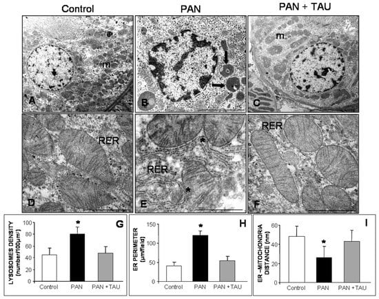 Ultrastructural evaluation at cortical proximal tubular level. (A,D) Lysosomes and mitochondria in cortical proximal tubules-S1 segment in control, (B,E) PAN nephrotic rats and (C,F) PAN rats pre-treated with TAU. (m): mitochondria; (RER): rough endoplasmic reticulum; arrow identifies lysosomes and asterisks identify the contact between organelles. (A–C) bars represent 1 µm and (D–F) bars represent 500 nm. Quantitative estimation of (G) lysosomal density, (H) RER perimeter, (I) lysosomes-mitochondria juxtaposition. * p < 0.05 versus control and PAN pre-treated with TAU groups.