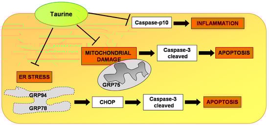 Taken together, our results suggest that dietary TAU significantly preserves ER and mitochondria features, promoting glomerular and tubular recovery and reducing experimental puromycin-induced damage in rat kidney. Intriguingly, TAU decreased ER stress, and in parallel, mitochondria-related apoptosis, drives mitochondria and ER expression of specific stress markers, hampering puromycin nephrotic damage (Figure 7). This study reveals that CHOP may be an upstream therapeutic TAU target able to drive downstream apoptosis triggered by ER and mitochondrial UPR in the puromycin model []. Finally, this translational study implies that TAU might act as a potential promising dietary additive in drug resistant-MCD patients. We only described the effective role of TAU in rat; new studies on this potentiality should be completed in the future.