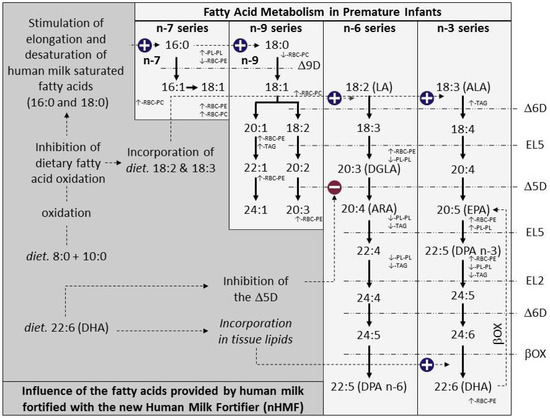 Schematic representation of the influence of dietary fatty acids provided by the nHMF. Differences (shown by the ↑ and ↓ symbols) between relative concentrations of FA provided by the nHMF or the cHMF in the compartments assessed are statistically significant (p <0.05). Metabolic pathways responsible for the biosynthesis of FA from the n-3, n-6, n-7, and n-9 series are displayed together with the enzymes involved (Δ9D, Δ9-desaturase; Δ6D, Δ6-desaturase, EL5, elongase 5; Δ5D, Δ5-desaturase; EL2, elongase 2; βOX, β-oxidation).
