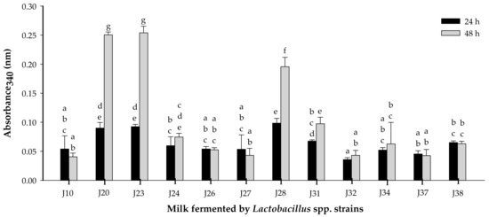 Lactobacillus strains from two species (six L. fermentum and six L. pentosus) were evaluated [19]. Proteolytic activity assessed at 24 and 48 h of fermentation showed significant differences (p < 0.05), and it was time and strain dependent (Figure 1). Strains of Lactobacillus fermentum J20, J23 and J28 presented the highest proteolytic activity (p < 0.05). On the other hand, strains J10, J24, J26, J27, J31, J32, J34, J37 and J38 were considered as weakly proteolytic. The high proteolytic activity for species L. fermentum may be related to a large number of proteases and peptidases present [24].