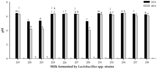 pH of milk fermented by Lactobacillus spp. strains at 24 or 48 h of fermentation. Mean ± SD (n = 3). Different letters indicate significant differences (p < 0.05) among all fermented milks. Strains: J10, J20, J23, J28, J32 and J38 are Lactobacillus fermentum; J24, J26, J27, J31, J34 and J37 are Lactobacillus pentosus.