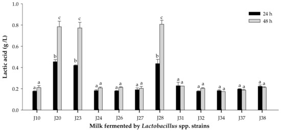 Lactic acid concentration in milk fermented by Lactobacillus spp. strains at 24 or 48 h of fermentation. Mean ± SD (n = 3). Different letters indicate significant differences (p < 0.05) among all fermented milks. Strains: J10, J20, J23, J28, J32 and J38 are Lactobacillus fermentum; J24, J26, J27, J31, J34 and J37 are Lactobacillus pentosus.