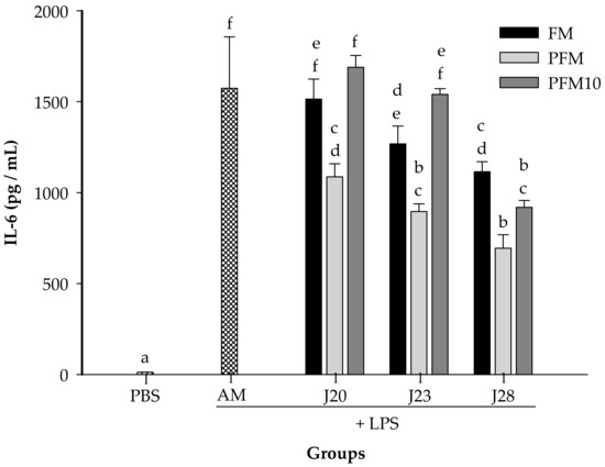 The IL-6 concentrations were determined in animals treated with LPS (Figure 4). Groups fed with FM/J23 or FM/J28 presented significantly lower (p < 0.05) IL-6 in serum, in contrast to the control group. However, FM/J20 did not show significant differences (p > 0.05) in IL-6 compared to the control group (AM). Furthermore, IL-6 concentrations in animals treated with PFM/J20, PFM/J23 or PFM/J28 were significantly (p < 0.05) lower than the control group (AM). Also, results showed that groups treated with PFM10/J28 significantly decreased (p < 0.05) concentrations of IL-6 in comparison to the control group. Nevertheless, PFM10/J20 and PFM/J23 were not significantly different (p > 0.05) from the control group.