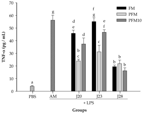 In the case of TNF-α concentrations (Figure 5), animals treated with FM/J20 or FM/J28 showed a reduction (p < 0.05) of TNF-α compared to the control group. Nevertheless, FM/J23 was not significantly (p > 0.05) different from the control group. Also, all PFM/J20, PFM/J23 or PFM/J28 treatments significantly reduced (p < 0.05) TNF-α concentrations when compared to the control group. Moreover, results showed that groups treated with PFM10/J20, PFM/J23, and PFM/J28 significantly decreased (p < 0.05) concentrations of pro-inflammatory TNF-α cytokines, in comparison to the control group (AM) (Figure 5). It is noteworthy that FM/J28 was able to reduce TNF-α in all the treatments, whether in fermented milk, pasteurized fermented milk or its fractions.