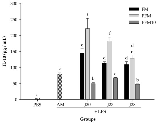 Furthermore, the IL-10 concentrations were determined post-LPS treatments (Figure 6). Animals treated with FM/J20, FM/J23 or FM/J28 presented IL-10 concentrations that were significantly (p < 0.05) higher than the control group. Moreover, serum concentrations of this cytokine from PFM with J20, J23 or J28 groups were also significantly (p < 0.05) higher than those in the control group. Nevertheless, the IL-10 concentration for all administered groups with PFM10 did not increase in comparison to the control group (Figure 6). This may be due to the fact that the peptidic nitrogen content in PFM10/J28 was significantly (p < 0.05) lower than that in PFM (0.20 vs. 0.30%).