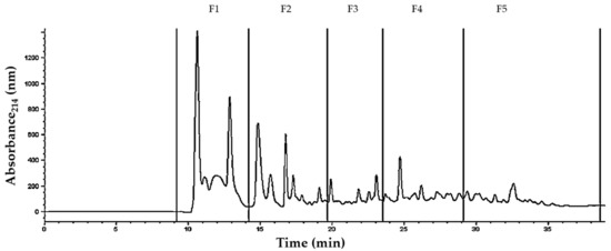 Peptide profiles in the water soluble fraction (<10 kDa) from pasteurized fermented milk (PFM10) with Lactobacillus fermentum J28, obtained by reversed-phase High Performance Liquid Chromatography at 214 nm. F1 to F5 correspond to collected fractions.