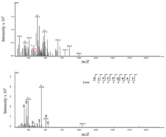 Typical mass spectrum corresponding to peptide sequence (VLPVPQKAV) collected from F4 obtained from milk fermented by Lactobacillus fermentum J28. (A) Triple-charged ion 317.4 m/z; (B) tandem mass spectrometry (MS/MS) spectrum for the specified ion in (A). After interpretation and comparison in the database, the fragment AA sequence matched β-CN (f185-193).