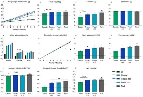 Effects of Western diets with different protein sources on body composition, energy intake and tissue weights. Male C57BL/6J mice were fed Western diets containing casein, frozen cod, fresh cod or pork as protein sources for 12 weeks. As a reference, a group of low fat (LF)-fed mice (n = 5) was also included and is shown as a dotted line. (a) Body weight development was measured and is shown for the first 9 weeks of feeding. (b) Body weight was measured and (c) fat mass and (d) lean mass were determined using nuclear magnetic resonance after 9 weeks of feeding. (e) Epididymal white adipose tissue (eWAT), inguinal white adipose tissue (iWAT) and perirenal/retroperitoneal white adipose tissue (p/r WAT) were dissected out after 12 weeks of feeding, and their masses were recorded; (f) Feed intake was recorded continuously, and cumulative energy intake (MJ) was determined and is shown for the first 9 weeks of feeding. The arrow indicates a significantly (p < 0.05) decreased energy intake in mice fed frozen cod and fresh cod compared to mice fed casein. (g) After 9 weeks of feeding, body mass gained per energy unit consumed and (h) fat mass gained per energy unit consumed were calculated; Apparent (i) fat and (j) nitrogen digestibility (%) were calculated based on feed intake and feces collected in the 6th week of feeding. (k) Livers were dissected out and weighed after 12 weeks of feeding. Data are presented as means ± SEMs (n = 10) and were analyzed using one-way ANOVA followed by Fisher’s LSD post hoc tests. Cumulative energy intake was analyzed by repeated measures ANOVA and Fisher’s LSD post hoc tests. *, ** and *** represent significant different from the Western diet containing casein at p < 0.05, p < 0.01 and p < 0.001 levels, respectively.