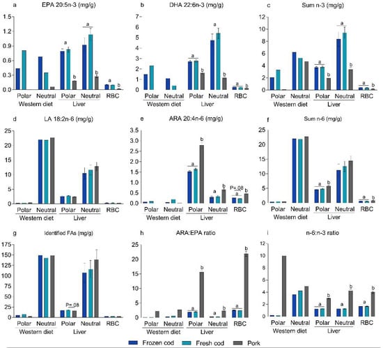 Fatty acid (FA) composition in polar and neutral lipid fractions in Western diets based on frozen cod, fresh cod, and pork as protein sources, and in mouse livers and red blood cells (RBCs) following intake of the different diets. Data from the Western diets represent the means of three samples, and data from the livers and RBCs represent means ± SEMs (n = 10). Results indicate mg FAs in the polar and neutral lipid fractions/g Western diet and livers, and mg FAs/g RBCs. Lipids from Western diets and livers were extracted and separated into polar and neutral lipid fractions. The FA compositions of the fractions from the Western diets and livers as well as the FA compositions of extracted lipids from RBC were quantification and determined; (a) eicosapentaenoic acid (EPA); (b) docosahexaenoic acid (DHA); (c) sum n-3; (d) linoleic acid (LA); (e) arachidonic acid (ARA); (f) sum n-6; (g) identified fatty acids (FAs); (h) arachidonic acid: eicosapentaenoic acid ratio (ARA:EPA); (i) n-6:n-3 ratio. Data from livers and RBCs were analyzed using one-way ANOVA followed by Fisher’s LSD post hoc tests. Different letters denote statistical significance (p ≤ 0.05) between the groups.