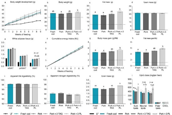 Effects of pork-containing Western diets with added n-3 PUFAs to match the level of n-3 PUFAs in a Western diet containing fresh cod. Male C57BL/6J mice were fed Western diets containing either fresh cod or fresh pork as a protein source for 12 weeks. The two pork diets were supplemented with either TAG-bound (pork n-3 TAG) or PL-bound (pork n-3 PL) EPA+DHA at levels matching the content of the fresh cod-containing diet. As reference, a group of low fat (LF)-fed mice (n = 5) was included and is shown as a dotted line. (a) Body weight development was determined and is shown for the first 9 weeks of feeding. (b) Body weight was measured and (c) fat and (d) lean mass were determined using nuclear magnetic resonance after 9 weeks of feeding. (e) Epididymal white adipose tissues (eWAT), inguinal white adipose tissues (iWAT) and perirenal/retroperitoneal white adipose tissues (p/r WAT) were dissected out after 12 weeks of feeding and their masses were recorded. (f) Feed intake was recorded continuously, and cumulative energy intake (MJ) was determined and is shown for the first 9 weeks of feeding; (g) After 9 weeks of feeding, the amount of body mass gained per energy unit consumed and (h) fat mass gained per energy unit consumed were calculated; Apparent (i) fat and (j) nitrogen digestibilities (%) were calculated based on feed intake and feces collected during the 6th week of feeding; (k) After 12 weeks of feeding, livers were dissected out and weighed (l). Lipids were extracted from livers (n = 7) and total lipids, neutral lipids, triacylglycerol (TAG), polar lipids and cholesterol (CHOL) were quantified, and results are presents as mg lipids per liver (mg lipids/g liver × liver weight (g)). Data are presented as means ± SEMs (n = 14–15), except for the lipid class analysis (n = 7) and were analyzed using one-way ANOVA followed by Fisher’s LSD post hoc tests. Cumulative energy intake was analyzed by repeated measures ANOVA and Fisher’s LSD post hoc tests. Different letters denote statistical significance (p ≤ 0.05) between the groups.