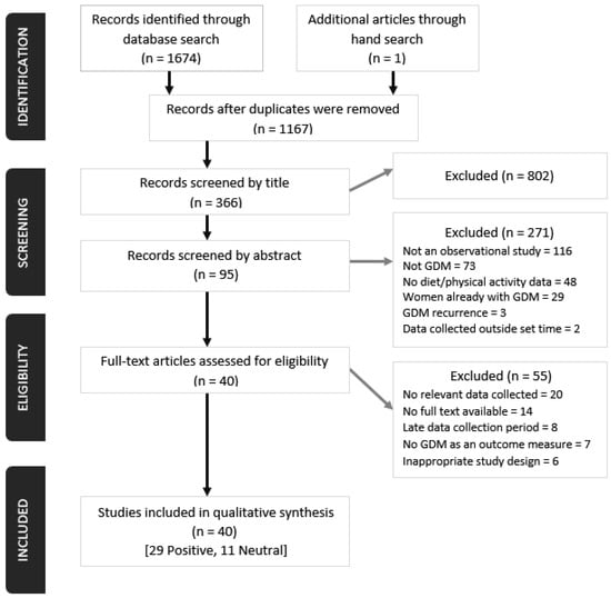 We extracted 1166 articles from the database searches, and one article was identified through hand-search. After screening and assessing for eligibility, we identified 40 journal articles which met inclusion criteria (Figure 1). Of these 40 articles, 23 reported data only on dietary intake, 15 only on PA and two articles reported on both dietary intake and PA. Twenty-nine studies (72%) obtained a positive quality rating and 11 (28%) were rated neutral (Table S2). All the articles reported findings from prospective cohort studies of which there were multiple publications from four major studies including Nurses’ Health Study II (n = 14) [24,25,26,27,28,29,30,31,32,33,34,35,36,37], Omega (n = 7) [38,39,40,41,42,43,44], Australian Longitudinal Study on Women’s Health (n = 4) [45,46,47,48] and Project Viva (n = 2) [49,50]. The most common reasons for exclusion of publications were unavailability of full texts, no relevant data collected necessary for the present review and late recruitment of study participants, consequently capturing dietary and PA information that were not reflective of the pre-pregnancy or early pregnancy period.