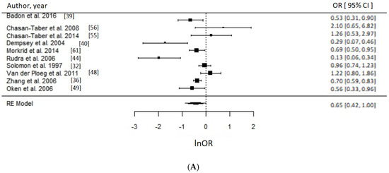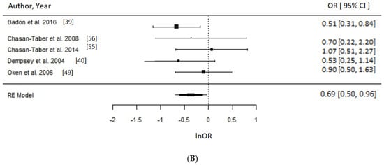 The following are available online at http://www.mdpi.com/2072-6643/10/6/698/s1, Table S1: Search Terms; Table S2: Modified quality assessment and risk of bias form obtained from the Evidence Analysis Manual: Steps in the academy evidence analysis process; Table S3: Characteristics of observational studies; Table S4: Natural odds ratio (lnOR) values before back-transformation correspond to Figure 3, Figure 4, Figure 5 and Figure 6. Figure S1: Assessing the risk of publication bias using funnel plots for different metaanalyses.