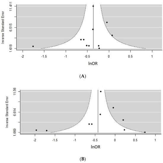 Tests revealed a variable degree of heterogeneity ranging from 15–95%. Based on an almost symmetrical distribution of data points in funnel plots Figure 7A (n studies = 10, z = −1.52, p = 0.13) and Figure 7B (n studies = 10, z = −0.65, p = 0.52), there was no evidence of publication bias. Remaining funnel plots are presented in supplementary materials section as they contained <10 studies in their analyses. This includes Figure S1a (n studies = 9, z = −1.90, p = 0.06) with some symmetry present and Figure S1b (n studies = 6, z = −2.96, p = 0.003) and Figure S1c (n studies = 4, z = −2.34, p = 0.02) suggesting presence of asymmetry and potentially publication bias.