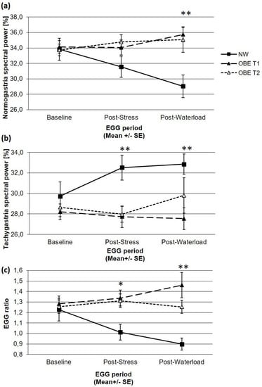 OBE and NW did not differ at baseline, but OBE had significant lower tachygastric activity and a higher normo- to tachygastria ratio than NW after the stress test. Furthermore, OBE showed significantly higher normogastric, but lower tachygastric activity than NW after the water load test, resulting in a significantly higher EGG ratio (Figure 1).