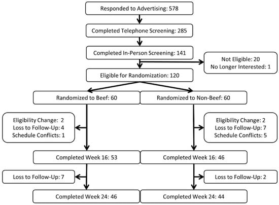 Subjects were randomly assigned to one of two energy-restricted diets: A HP diet with instructions to consume ≥4 weekly servings of lean beef as the only source of red meat (B), or a HP diet with instructions not to consume any red meat for the duration of the study (NB). The details of the weight loss intervention were previously published [29]. Briefly, all subjects participated in the State of Slim (SOS) group-based weight management program [31] at the AHWC for 16 weeks. Following the 16-week SOS program, subjects were instructed to continue following the SOS diet plan and B or NB assignment for an additional 8 weeks. Subjects had no contact with the SOS group leader or research staff during this time (except to schedule and confirm the week 24 testing visit).