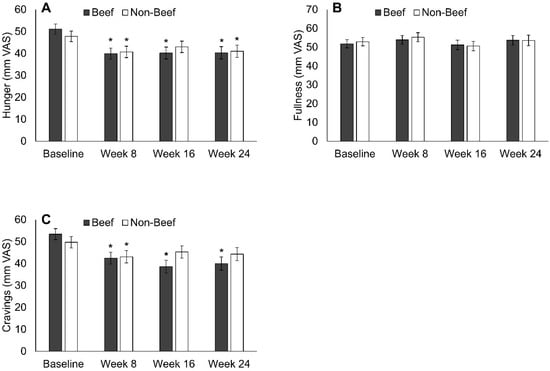 Changes in hunger (A), fullness (B), and cravings (C) during the Beef WISE Study. Hunger was reduced in both groups at weeks 8 and 24 compared to baseline, and also at week 16 in B. Fullness during weight loss was not different from baseline. Cravings were reduced in B at all intervention time points compared to baseline, and were reduced in NB at week 8 but not weeks 16 or 24. * Indicates significantly different from baseline (p < 0.05) by linear mixed model analyses (SAS, Proc Mixed).