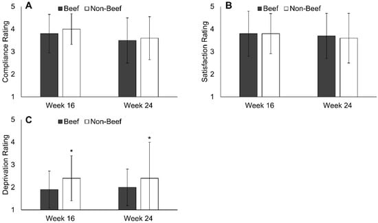 Ratings of dietary compliance (A) and satisfaction (B) were not different between groups during the Beef WISE Study. Feelings of deprivation (C) were greater in NB vs. B at weeks 16 and 24. * Indicates significant difference between groups (p < 0.05) by independent t-tests (SAS, Proc Ttest).