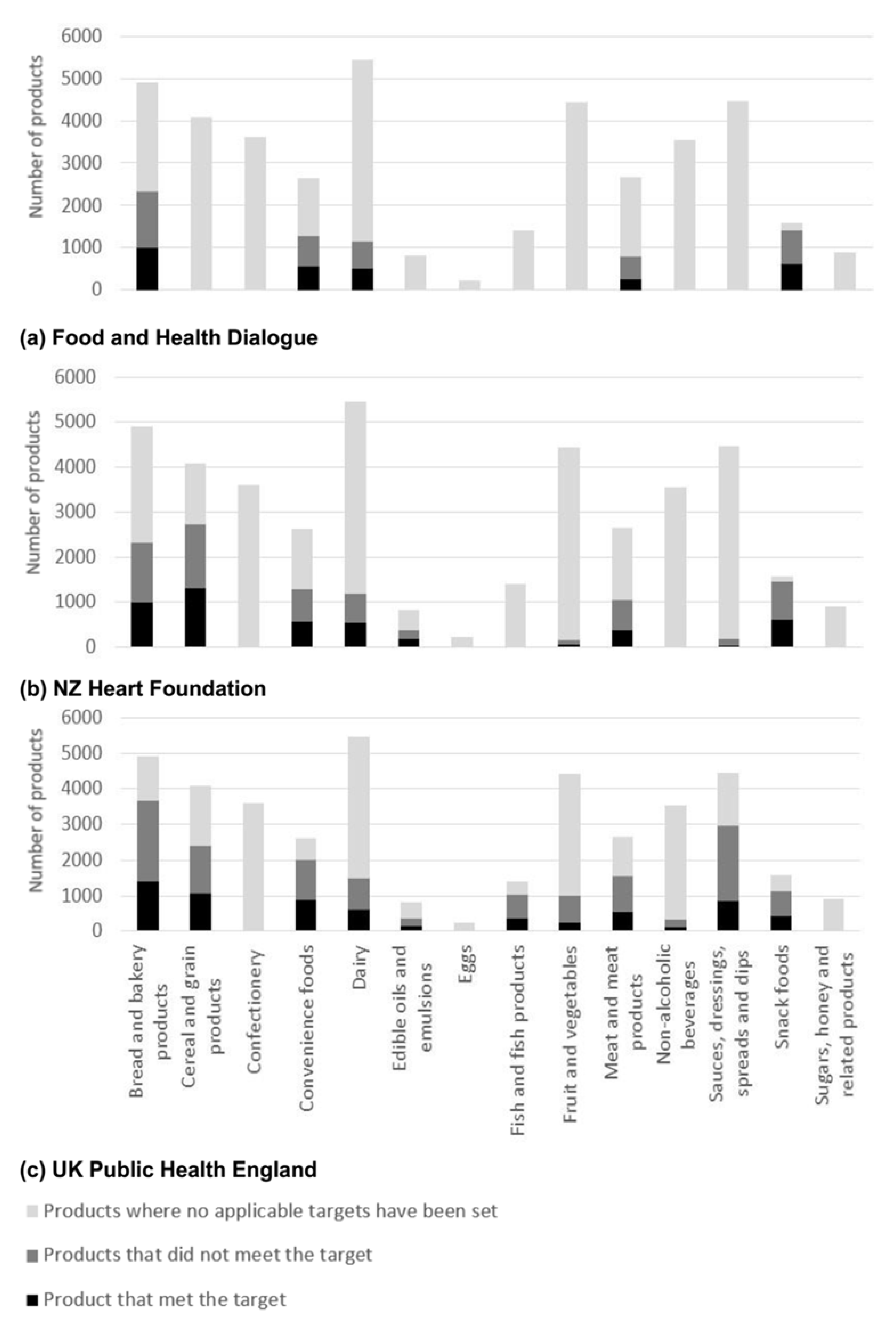 | Reformulation targets | Progress towards establishing of reformulation targets for risk-associated nutrients and/or the proportion of products that meet these targets may indicate the healthiness of a nation’s food supply. This assessment requires detailed nutritional information about individual products [21,22]. |