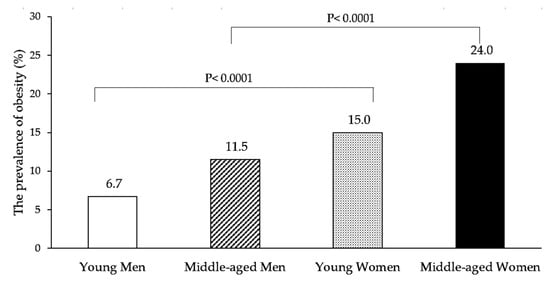 In young groups, obesity prevalence was significantly higher in women than in men. Similar significant outcomes were found in a middle-aged group. Figure 1 shows the significant differences in the prevalence of obesity (all p < 0.0001). Moreover, the prevalence of obesity increased by age. In the group aged 46–55 years, the prevalence of obesity slightly decreased in both men and women. In all age groups, the prevalence of obesity was significantly higher in women than in men. (Figure 2).