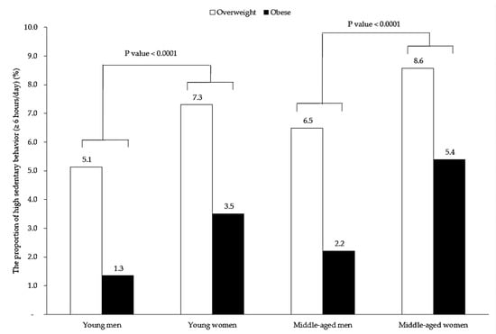 Furthermore, there were significant differences (p < 0.0001) in the proportions of high sedentary behaviors (inactivity) between young overweight and obese men and women and among middle-aged overweight and obese men and women (Figure 3).
