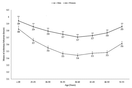 The mean duration of sedentary behaviors decreased in the group aged 20–40 years and increased after 40 years of age. In all age groups, significant differences were found between men and women (p < 0.0001) (Figure 4).
