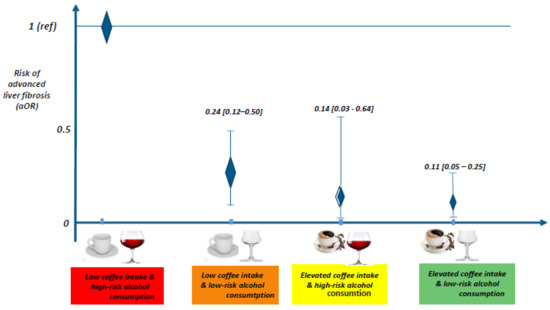 After multiple adjustment, compared with patients with low coffee intake and high-risk alcohol drinking who had a higher risk of advanced fibrosis (reference group), patients with low coffee intake and low-risk alcohol drinking had a 76% lower risk of ALF aOR (95% CI): 0.24 (0.12–0.50)). Among those with high coffee intake, high-risk alcohol consumption seemed to have no effect on liver fibrosis, with these drinkers having at least an 86% lower risk of advanced fibrosis than the reference group (0.14 (0.03–0.64) in high-risk alcohol drinkers and 0.11 (0.05–0.25) in low-risk alcohol drinkers) (Table 2 and Figure 1).