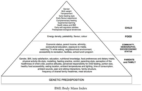 The child’s ecological niche includes family and peers, which are both influenced by community, society, media, and food offering. Variety and complexity of children’s milieu increases throughout life [7]. Parents provide food environments and experiences with food and eating for their children. Children model themselves on their parents’ eating behaviours, lifestyle, eating-related attitudes, and satisfaction or dissatisfaction regarding body image.