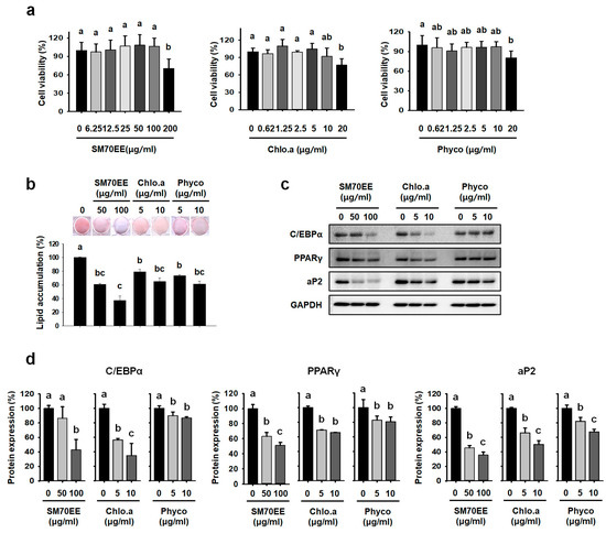 SM70EE, chlorophyll a, and C-phycocyanin inhibit adipogenic differentiation in 3T3-L1 cell. (a) Effect of SM70EE, chlorophyll a, and C-phycocyanin on cell viability in 3T3-L1 preadipocytes, determined using a 24-h MTT assay. (b) Effect of SM70EE, chlorophyll a, and C-phycocyanin on lipid accumulation, determined using oil red O staining, in 3T3-L1 adipocytes. A differentiation-inducing cocktail with or without SM70EE, chlorophyll a, or C-phycocyanin was added to 3T3-L1 adipocytes for 8 days. (c) Western blot analysis of adipogenic markers (C/EBPα, PPARγ, and aP2) after 8 days of incubation of 3T3-L1 adipocytes in differentiation medium. (d) The specific bands in (c) were quantified and are presented as graphs. Data are expressed as mean ± SD (n = 3). Values with different letters are significantly different, p < 0.05 (a > b > c).