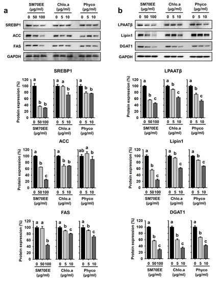 To elucidate the mechanisms of the lipogenic effect of SM70EE, chlorophyll a, and C-phycocyanin, we analyzed the expression levels of the lipogenic genes SREBP-1c, ACC, FAS, LPAATβ, lipin1, and DGAT1 by western blotting. Culture in differentiation media enhanced the expression of SREBP-1c, its downstream target, PPARγ, and the lipogenic enzymes ACC and FAS in adipocytes [32,33]. As shown in Figure 2a, protein levels of SREBP1, ACC, and FAS were lower in the presence of SM70EE. Consistent with the above data, addition of the SM70EE index compounds chlorophyll a or C-phycocyanin dramatically reduced the expression of the lipogenic markers LPAATβ, lipin1, and DGAT1 (Figure 2b). Taken together, our data show that SM70EE, chlorophyll a, and C-phycocyanin significantly suppress lipogenesis by reducing lipogenic gene expression during the differentiation of 3T3-L1 cells.